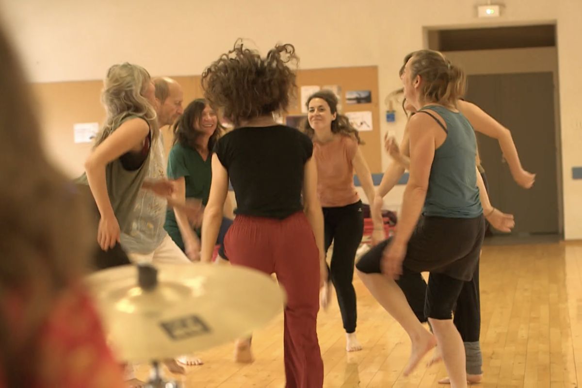 Formée par la chorégraphe Elsa Wolliaston, Aurélia Fradin transmet une dizaine de danses où la répétition du geste est centrale. Les danses prennent leurs sources dans les cultures rituelles africaines, irriguées par d’autres influences notamment asiatiques. Cette gestuelle ouvre à une palette de sensations : ancrage, axe, rebonds, vibrations dans le sternum, mobilité du bassin, ondulation de la colonne vertébrale, envol. Avec Gwenaëlle Chastagner Angei, à la batterie, le binôme donne à vivre cette pratique avec générosité, créativité et joie.