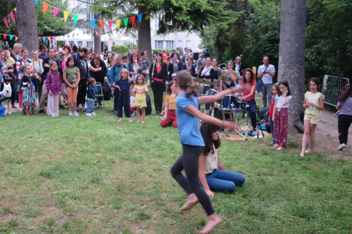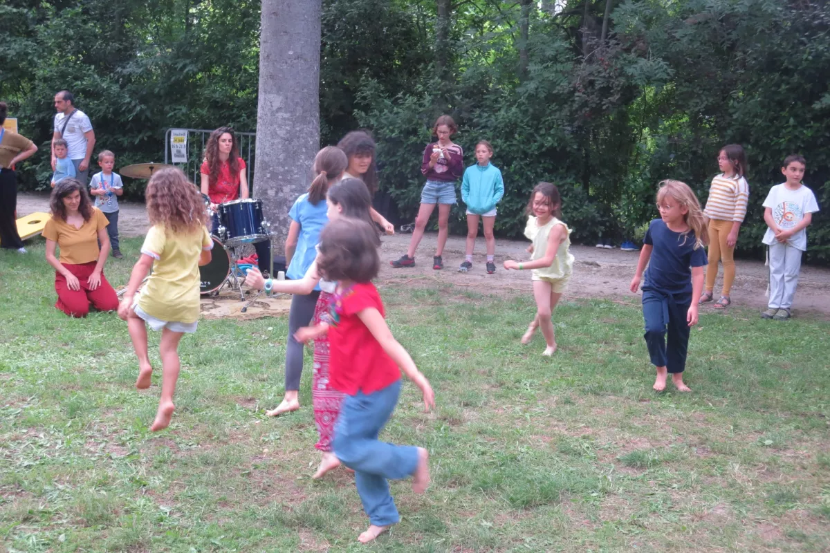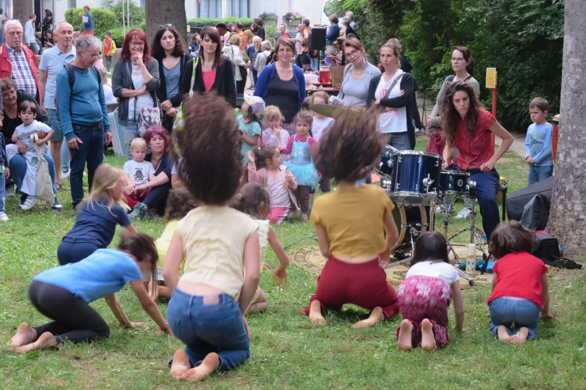 Le cours mêle gestuelle d’inspiration africaine, danse contemporaine et diverses pratiques corporelles. Aurélia Fradin crée une pédagogie qui allie immersion dans le mouvement, transmission et jeux d’improvisation. Accompagnée en direct par Gwenaëlle Chastagner Angei à la batterie, la danse devient un dialogue avec la musique, un espace pour l’expression, l’écoute du corps et la créativité des enfants.